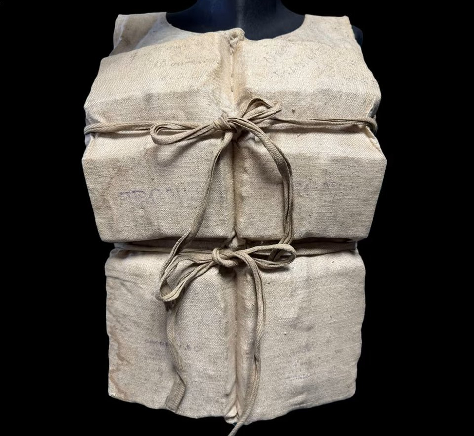 The flotation device was worn by Laura Mabel Francatelli, a first-class passenger on the doomed ocean liner. The cream-colored life jacket, made of canvas with cork-filled sections, has been displayed at museums in both the United States and Europe.