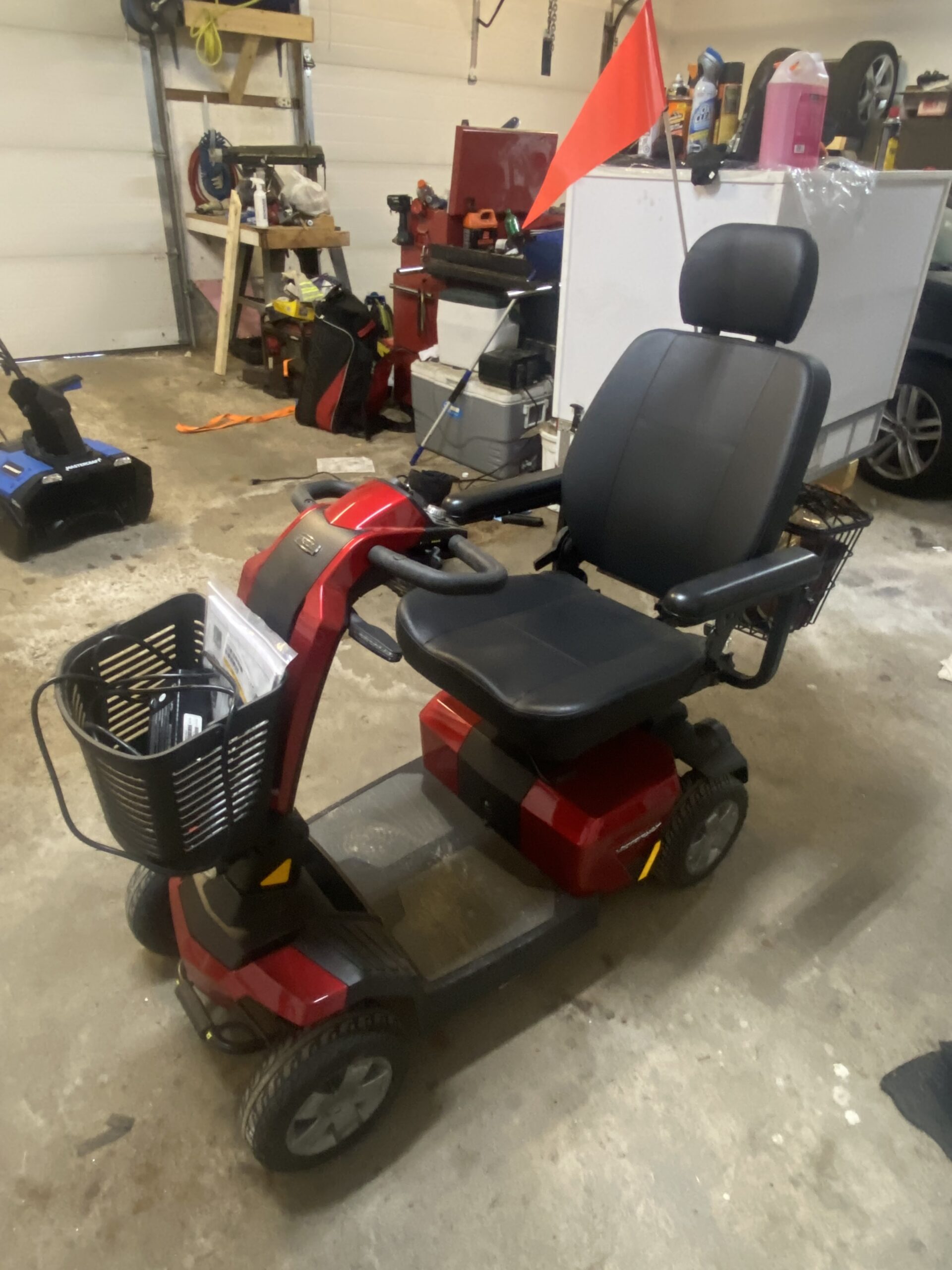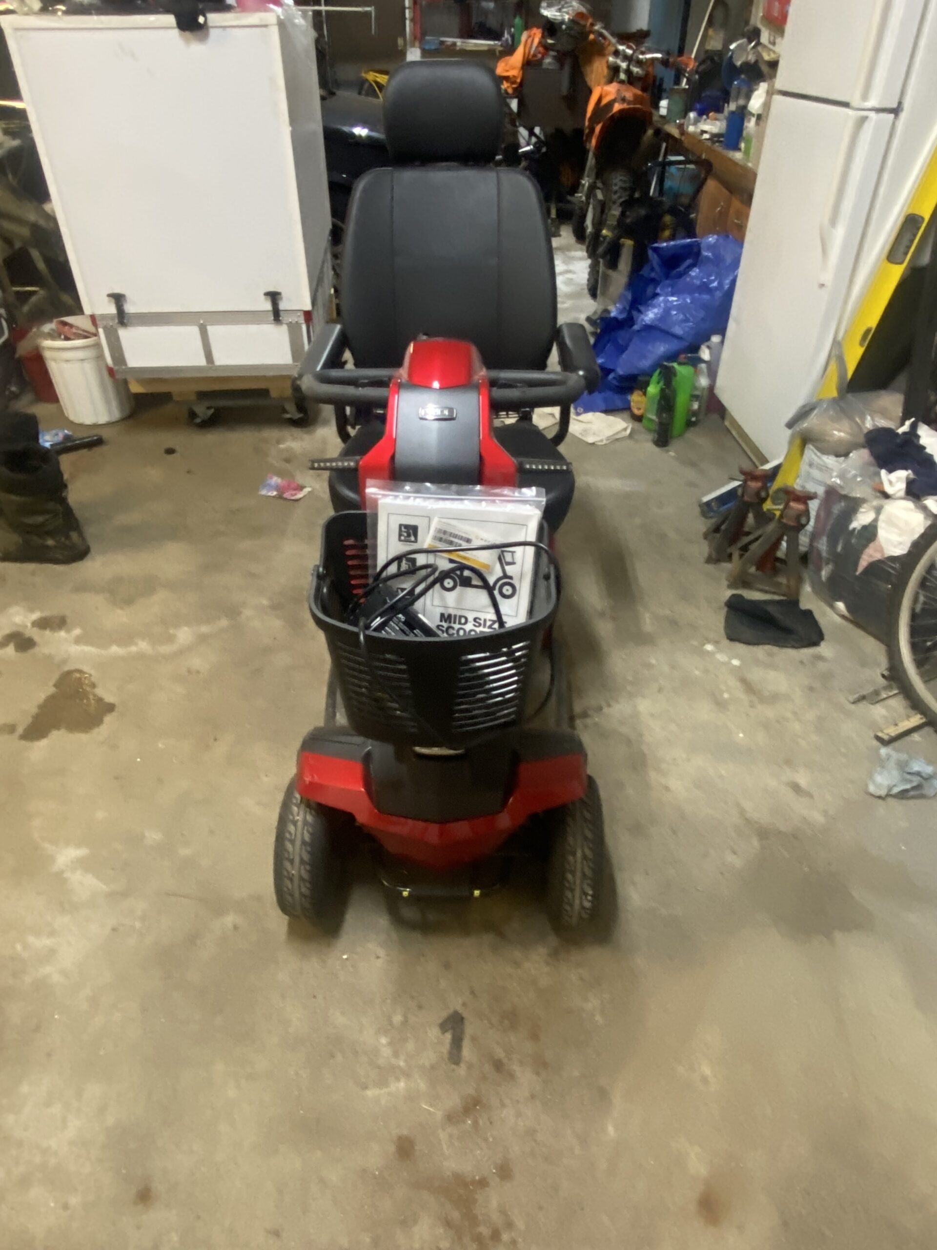 Electric mid size scooter with only 10 hours of driving. This has a front and back basket, a long flag with a triangle for road driving, owners manual and a cover.