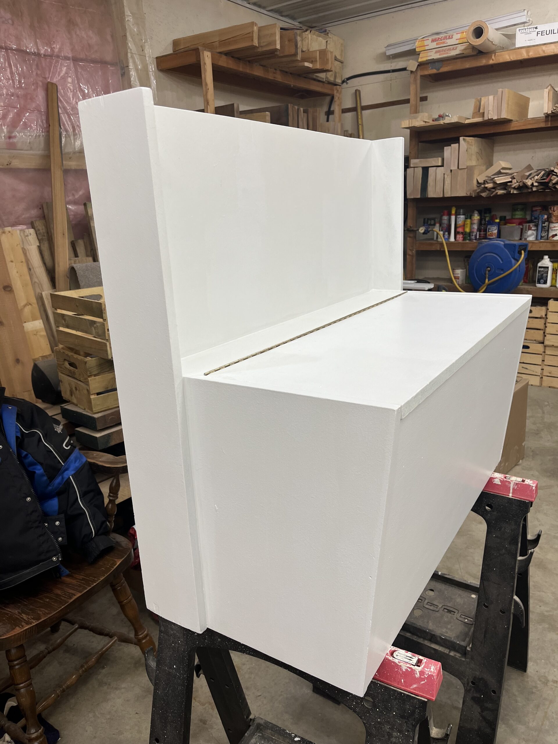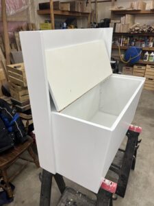 Entryway bench with storage built with plywood. It has 2 fresh coats of primer ready to paint according to your decor.