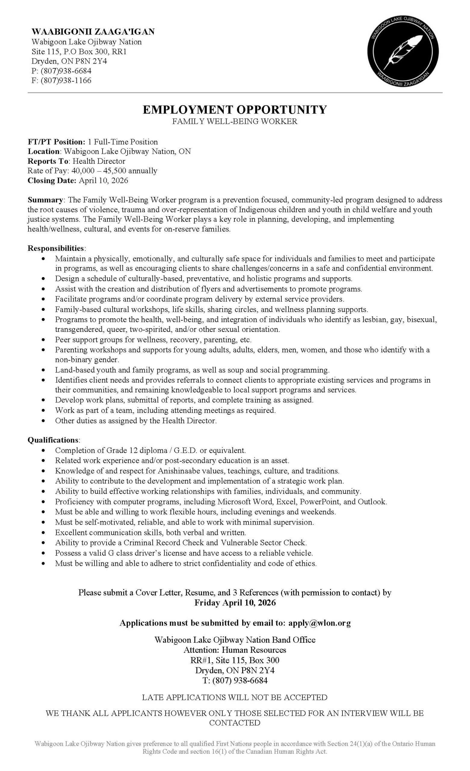 Wabigoon Lake Ojibway Nation is currently looking to hire a: Family Well Being Worker