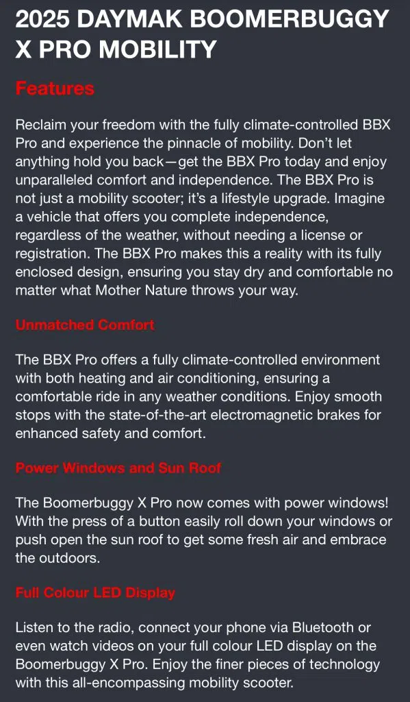 This is a new unit, has 6 kilometres on it. Daymak Boombuggy X Pro. Comes with a 60 volt battery system, as well it has air conditioning, heat, keyless entry, power locks and windows, sunroof and rear window open as well. As well there is a stereo with Bluetooth and also a back up camera. If interested please contact Richard. Pick up will be in Dryden ON. More info in photos. Message for price