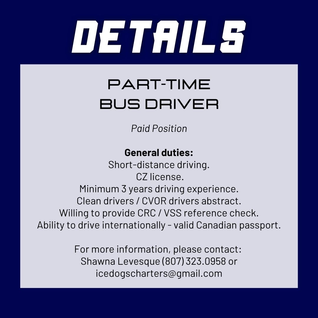 The Dryden GM Ice Dogs are looking for a reliable and dedicated part-time bus driver to support our charter operations.