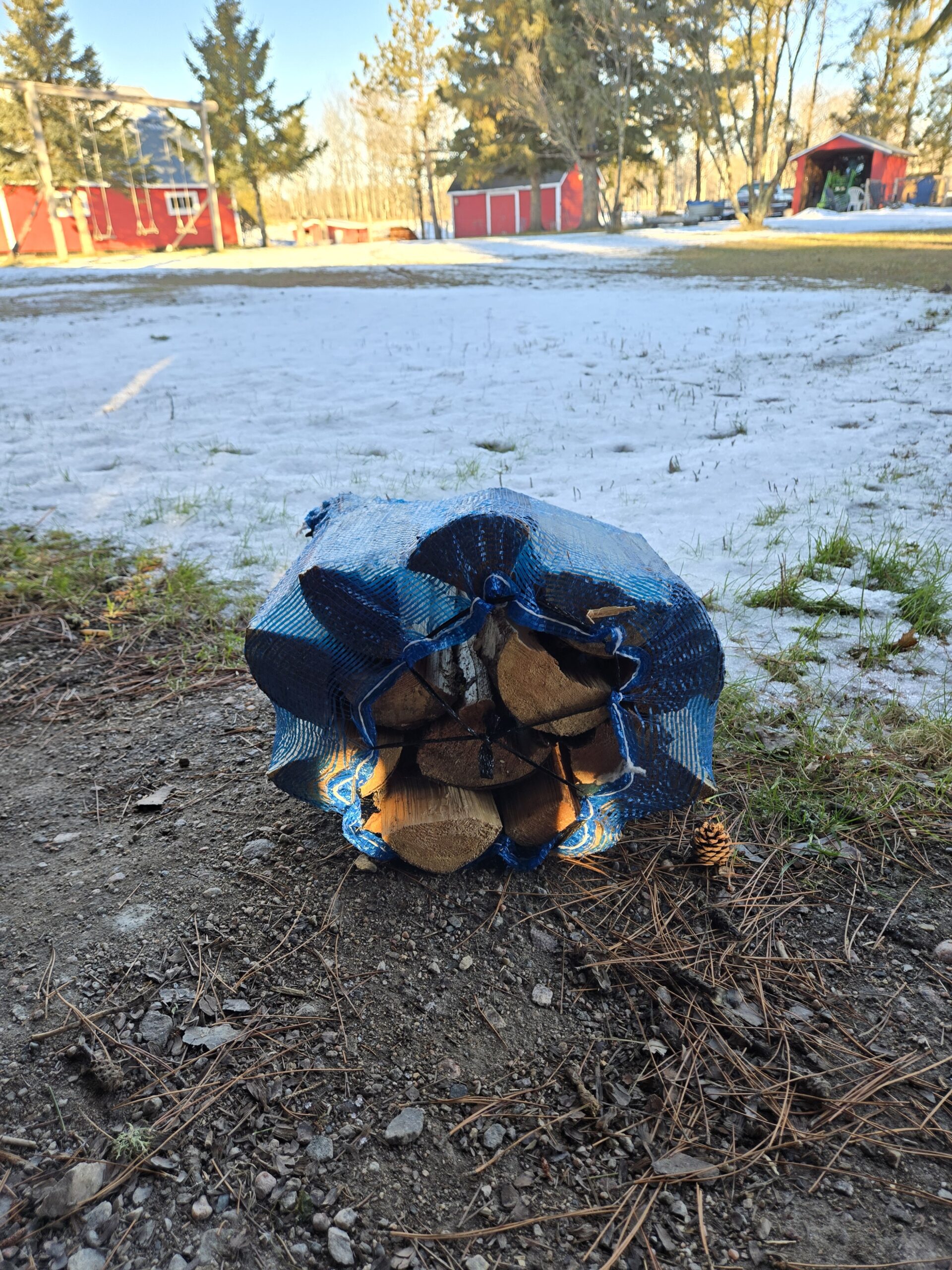 Seasoned pine firewood. 12-13 pieces per bag! $7.00/bag. Convenient for a quick warm 🔥!