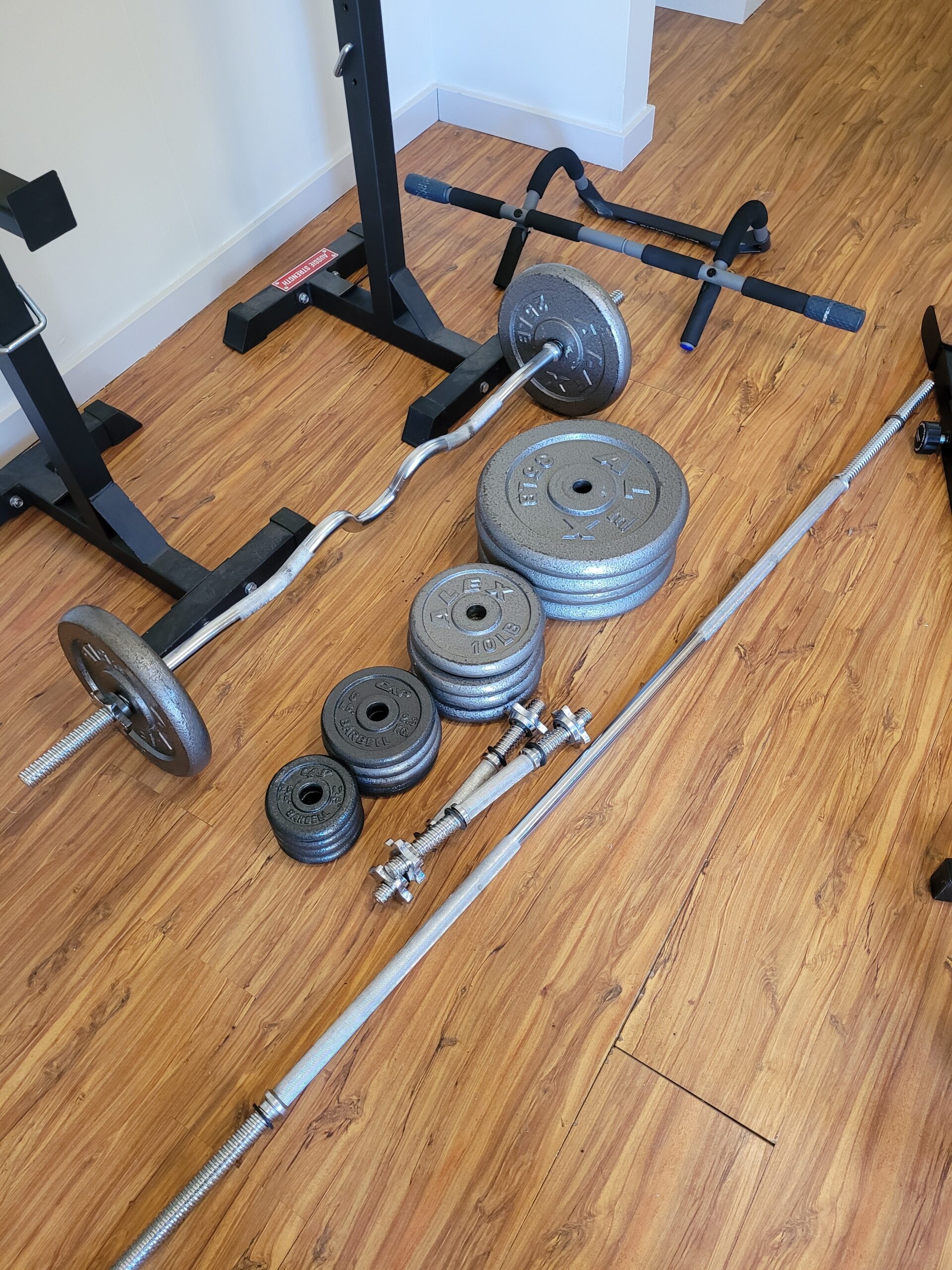 Weight bench with leg extension, with squat stands, chinup bar (fits in door frame, no screws or anything required). 6.5' bar, ez curl bar and...
