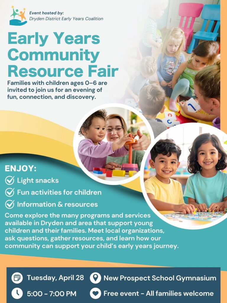 A resource fair is coming up in Dryden next week. The fair will bring together agencies, daycares, preschools, and community partners to share information, connect with families, and highlight services that promote healthy development for newborns to 6 years.