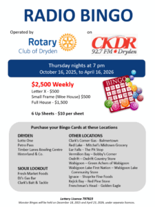 The Rotary Club of Dryden is very sorry that, due to a processing and distribution error, Rotary Radio Bingo cards dated for both December 4th and December 11th are being sold at this time by our various vendors.