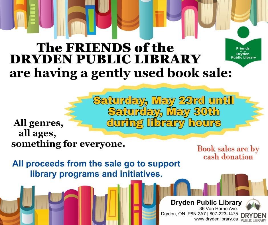 Dryden Public Library 36 Van Horne Ave, Dryden, CanadaThe Friends of the Library will be having a gently used book sale from Sat, May 23 until Sat, May 30 at the library. Book sales are by donation and […]
