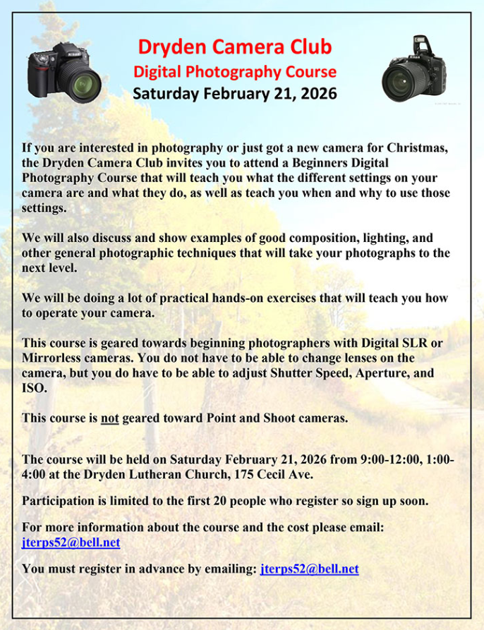 - ![]() ![]() Beginners Digital Photography Course If you are interested in photography or just got a new camera for Christmas, the Dryden Camera Club invites you to attend a Beginners Digital Photography Course that will teach you what the different settings on your camera are, what they do, and teach you when and why to use those […] $25