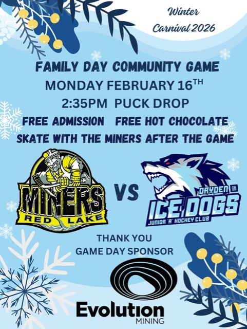 ![]() ![]() Get Ready for the Red Lake Winter Carnival! As in past years, the carnival takes place during Family Weekend, from Friday, February 13 to Monday, February 16. It’s the perfect time to enjoy the outdoors, warm up with indoor activities, and make lasting memories with family and friends. Want to know what’s happening? Check out […] - ![]() ![]() Tickets are now for sale for the Family Dance at the Howey, Balmer and Red Lake Community Centre. Admission is $2.00 | 17 events,