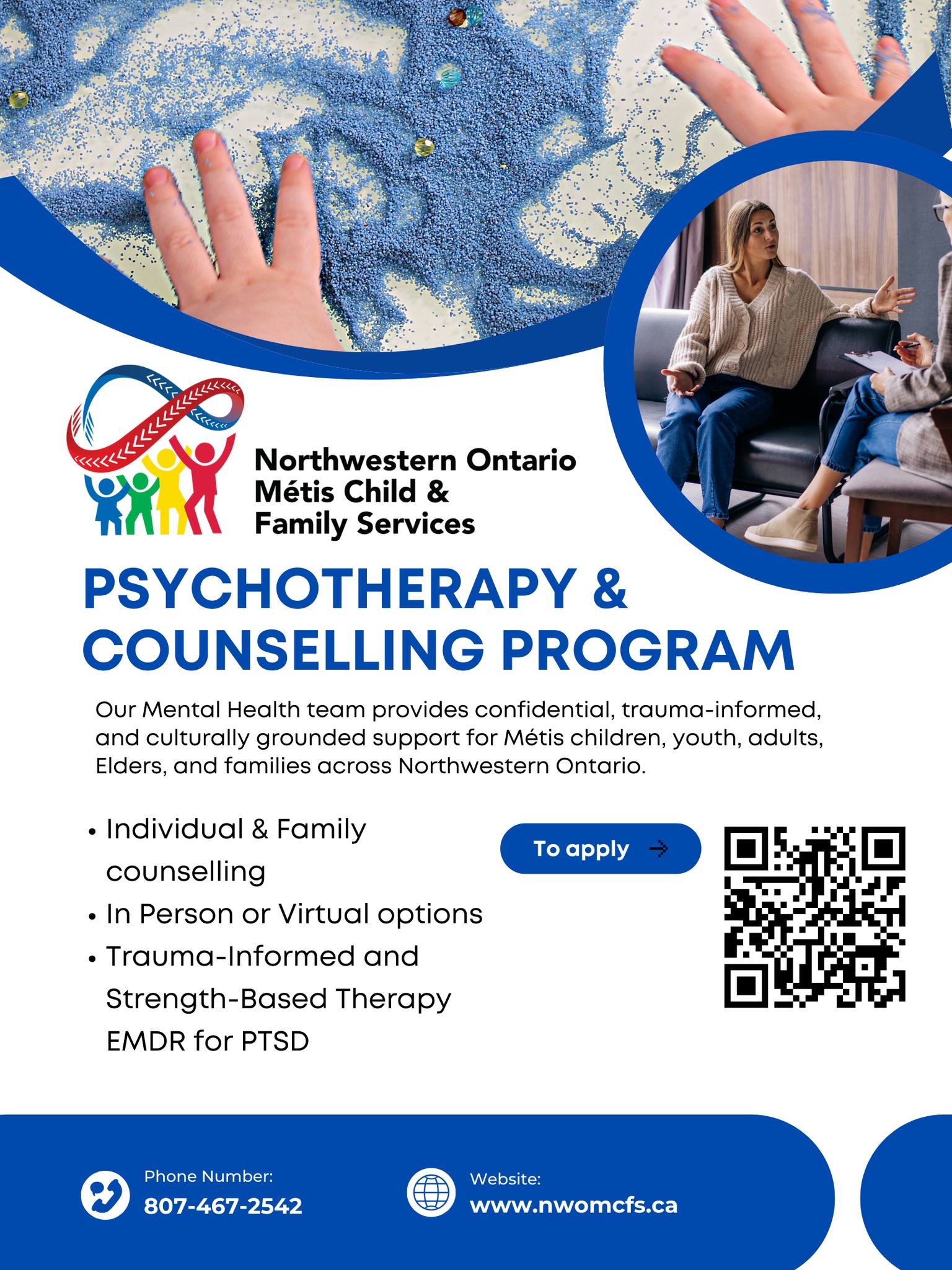 Professional Counselling and Psychotherapy Services now being offered in all four locations (Kenora, Dryden, Fort Frances and Atikokan) Open to Metis Households. Services will be provided in person or by Zoom. An Intake is required for all individuals. Please apply using the QR code below or call our central office at (807) 467-2542.