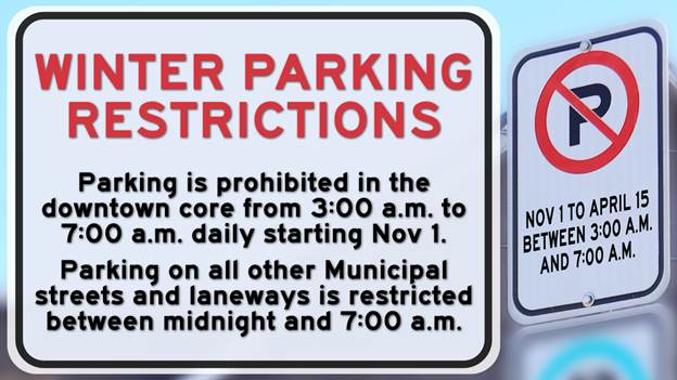 For the remaining Municipal streets and laneways, no parking is allowed between midnight and 7:00 a.m. when winter parking restrictions are in place.