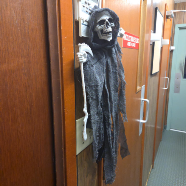 Yesterday my dad came to visit me at work and brought me some supplies. As he’s chuckling away helping me find places to hang the skeleton.