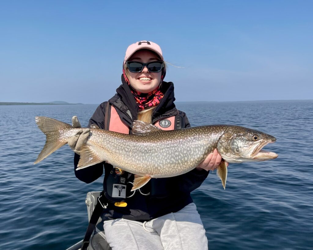 Maddi had just masterfully wrestled a new Personal Best, 42 inch / 30 lb. Lake Nipigon Lake Trout to the boat… a fish of a lifetime… eclipsing her 12 lb. previous best Laker by 18 lbs!!!